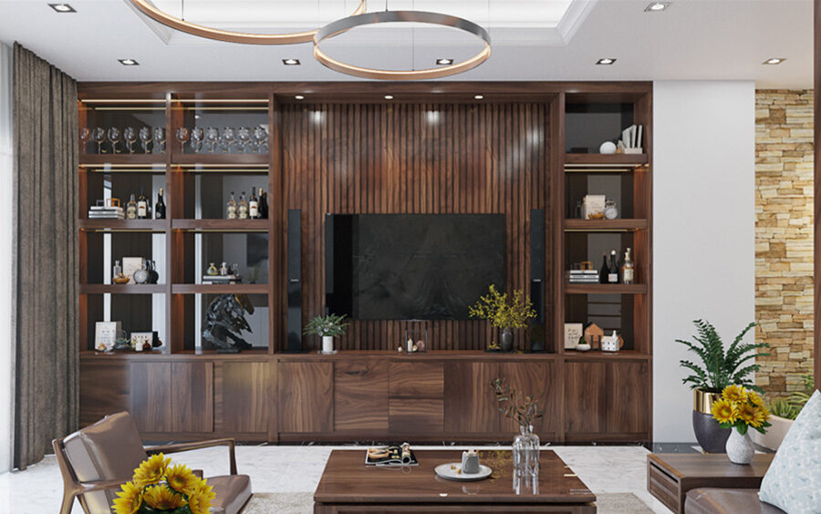 Không gian đầu tiên khi bước vào nhà chính là phòng khách – nơi gia đình đón tiếp khách. Gây ấn tượng trong không gian này là chất liệu gỗ tông màu trầm cùng đường vân ấn tượng. Thiết kế của bộ bàn ghế bằng gỗ tự nhiên đơn giản, vững chãi và chắc chắn. Kết hợp với chất liệu da nâu sang trọng khiến căn phòng càng thêm phần thanh lịch. Đặc biệt nhất trong không gian có lẽ là vách tivi được làm hoàn toàn bằng gỗ công nghiệp. Tủ rượu thiết kế âm tường cùng các ngăn tủ dưới để thuận tiện cho việc cất trữ đồ đạc.