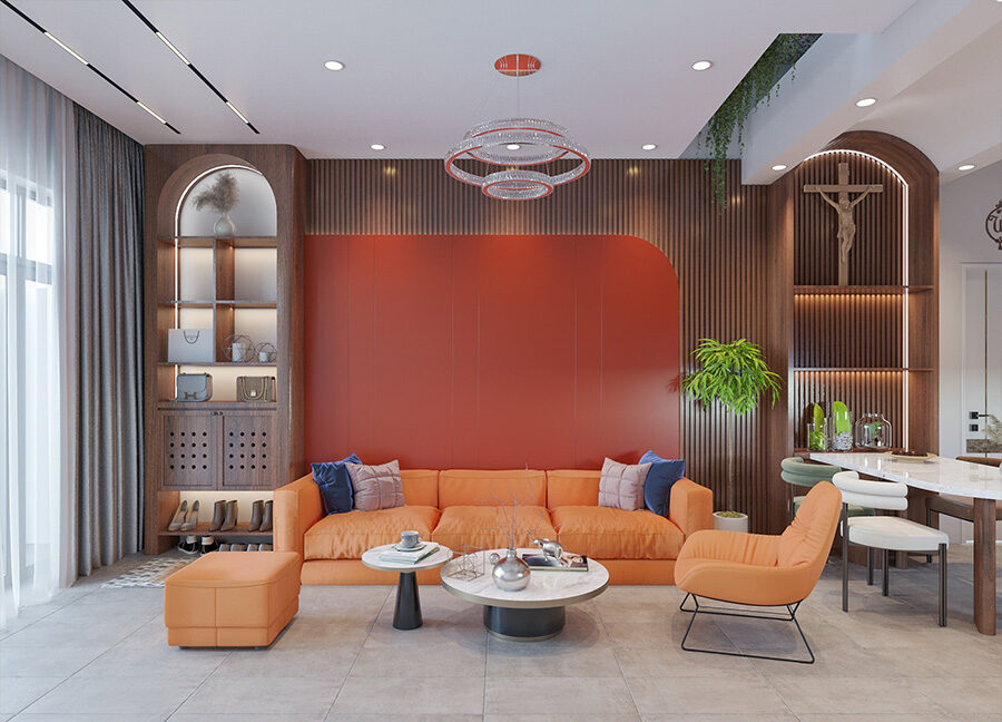 Dự án nội thất nhà phố Mrs.Nguyệt do Nội thất Wyn Eco phụ trách Thiết kế – Thi công nội thất. Ở dự án này, KTS lựa chọn phong cách hiện đại với những gam màu nổi bật dựa theo sở thích của khách hàng. Màu sắc vẫn luôn là một mảnh ghép quan trọng tạo nên tổng thể hài hòa và ấn tượng. Chúng đưa lối cảm xúc và thể hiện câu chuyện của những người sống trong đó. Căn nhà mang một màu sắc ấm cúng với điểm nhấn là những mảng màu đỏ cam nổi bật.